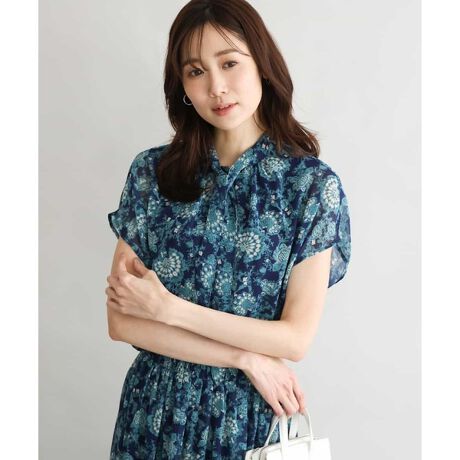 涼しげな印象の更紗模様のプリントシフォンブラウス。どちらを前にしても着こなせる前後2way仕様で、引っかけて垂らすだけのタイデザインがポイントに。
