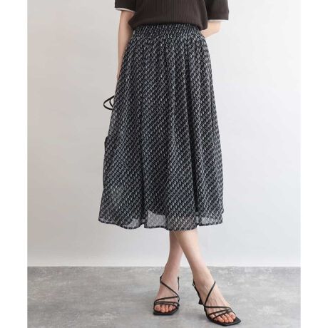 幾何柄がきれいめな印象の総柄スカート。広がり過ぎないシルエットは大人がちょうどよく着こなせます。オールウエストゴム仕様でストレスフリーな着心地も嬉しい。