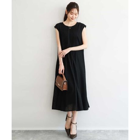 幾何柄のレースが大人見えするワンピース。フロントにタックを入れ、裾にかけてきれいに広がるAラインシルエットに仕上げました。身体のラインを拾わず涼しく着られるのも嬉しいポイント。ノースリーブですが、肩から少し出る袖丈が一枚でも着こなしやすい。