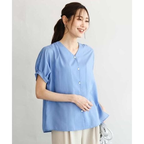 涼しげなVネックとタックを取った袖がポイントのブラウス。おしゃれ見えも叶えつつ、気になる二の腕のラインもカバーしてくれます。前釦タイプなので着脱もラクチン。