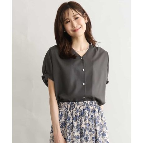 涼しげなVネックとタックを取った袖がポイントのブラウス。おしゃれ見えも叶えつつ、気になる二の腕のラインもカバーしてくれます。前釦タイプなので着脱もラクチン。