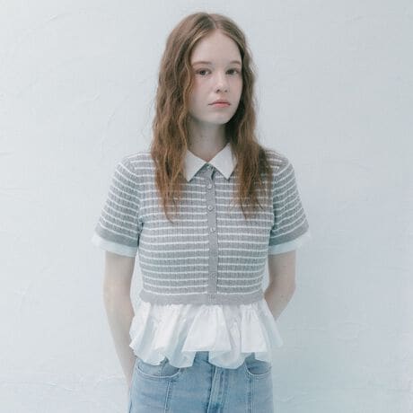 ・ケーブルニットにシャツ素材の襟と裾フリルをドッキングしたデザイン