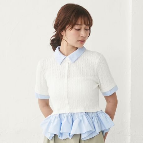 ・ケーブルニットにシャツ素材の襟と裾フリルをドッキングしたデザイン