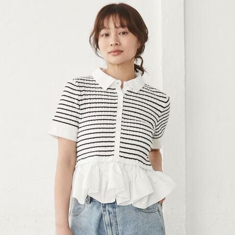 ・ケーブルニットにシャツ素材の襟と裾フリルをドッキングしたデザイン