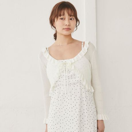 ■シアーな透け感とフリルディテールで華やぐ、七分袖ニットカーディガン■