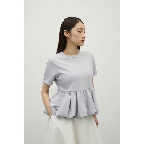 [型番:500JSA80-2201]モデル身長163cm(FREEサイズ着用)ボリューム感にこだわった裾のバルーンディテールがポイントのカットトップ。もちっとした肌触りが心地よいダンボール素材を使用しており、ストレッチ性にも優れ、快適な着心地と動きやすさを兼ね備えた一枚です。ナロースカートやワイドパンツなどシンプルなボトムスと合わせるだけで、スタイリングが完成します。透け感WHTややあり、ストレッチあり。【お手入れ方法】マシンウォッシュ可