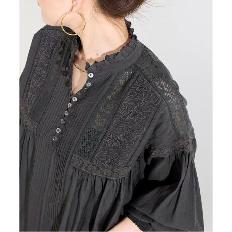 ヨーロッパのヴィンテージを感じさせるようなリバーレースを含む3種類のレースと、刺繍やピンタックが入った豪華なブラウス。透け感としっとりとした落ち感のあるレーヨン混の素材が上品な印象です。ヨーク下からギャザーが入っていてふわっとしたシルエット。袖口はシャーリング仕様で簡単に捲し上げられます。