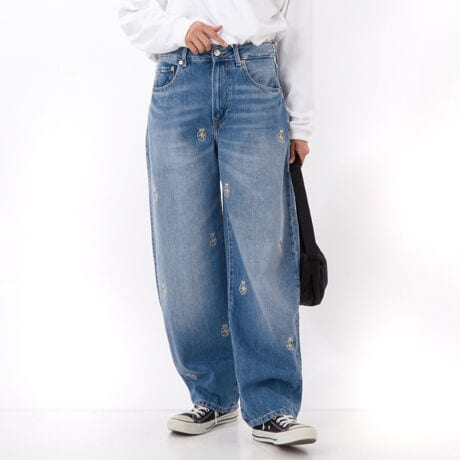 ヴィンテージライクな色落ちとともにクレスト刺しゅうをちりばめたバレルレッグジーンズ。立体裁断によるカーブラインが特徴で、体型カバーとスタイルアップのベストバランスを生み出します。裾は広がりすぎず、足元もすっきり。上半身をコンパクトにまとめれば、デザインを活かした着こなしが楽しめます。