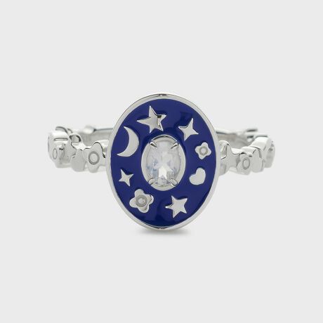 子供の頃の宝物はお気に入りを集めたシール帳。好きなものにはなんでもシールを貼り付けて自分色に飾った、少女だったころの思い出。そんなエモーショナルな情景を、ぎゅっと詰め込んでデザインしたリングです。小さなシールをイメージして、たくさんのモチーフをランダムにちりばめました。ホワイトラブラドライトの淡い虹色の輝きと、エポキシ樹脂のブルーが、懐かしくもシックな雰囲気。たっぷりの遊び心が新鮮な、コーディネートの主役になる1本です。※天然石や天然素材を使用しているものは、サイズ・色味・風合いの違いや、若干の傷、内包物の有無などに個体差があります。予めご了承ください。※サイズ直し不可。※本製品には樹脂(エポキシ)素材を使用しております。美しい状態を長くお楽しみいただくため、高温になる場所での保管はお控えください。環境によっては、変質や変色が生じる場合がございます。