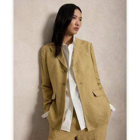 デラヴェリネンで丹念に仕立てたシングルブレストのブレザー。特別な工程によりヴィンテージ風の特性を演出したアイテム。ノッチドラペル、ウエストのダーツ、背面の裾のベントなど、トラディショナルな仕立てのディテールが特徴・ストレートフィット / 腰下丈・ノッチドラペル / 左のラペルにボタンホール / 2つボタンのシルエット / 襟と前立てにピックステッチ・長袖、4つボタンのカフス / フロントウエストにフラップポケット2つ / 左胸に斜めポケット・フロントウエストにダーツ / 前後にプリンセスライン / 背面の裾にベント・袖は裏地付き・モデル身長178cm、着用サイズ4 【素材】・本体:麻 100% 袖裏:ポリエステル 55%、レーヨン 45%【生産国】カンボジア