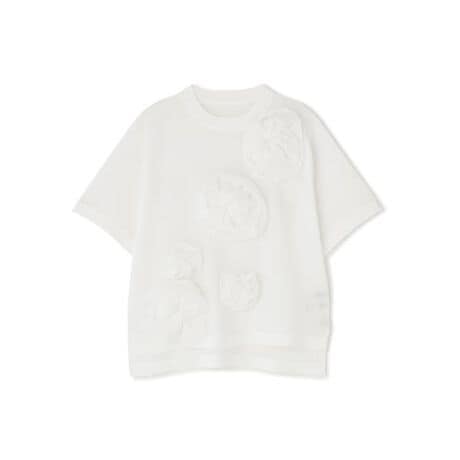やや透けた編地のニットTシャツに同じ編地で作られたコサージュがついたデコラティブな1着でアクセサリーいらずで華やかに決まります。