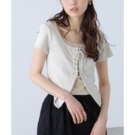 レイヤード風に見えるカットソー。コンパクトな半袖カットソーで、前のレースアップが開く仕様です。前身頃のみ脇に縫い込まれているのでさらっと1枚で着られます。インナー部分が少し短いのでヘルシーな肌見せも可能。短丈なのでハイウエストボトムスと合わせると好バランスです。より肌見せを楽しむために、ジャストウエストやローウエストのボトムスと合わせるのもおすすめです。※モデルの着用画像の場合、光の当たり具合により、実際の色味と異なって見えることがございます。色味は、商品単体の画像をご参照ください。