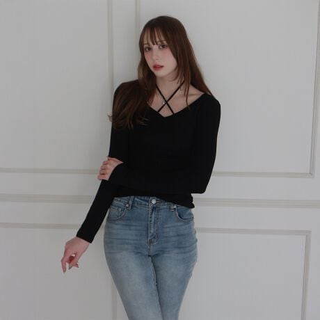・胸元でクロスする首紐デザインがポイントの長袖トップス。