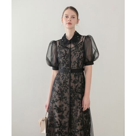 繊細なレースカラーとボディ全体に施されたスパンコール刺繍が目を引く、華やかなドレス
