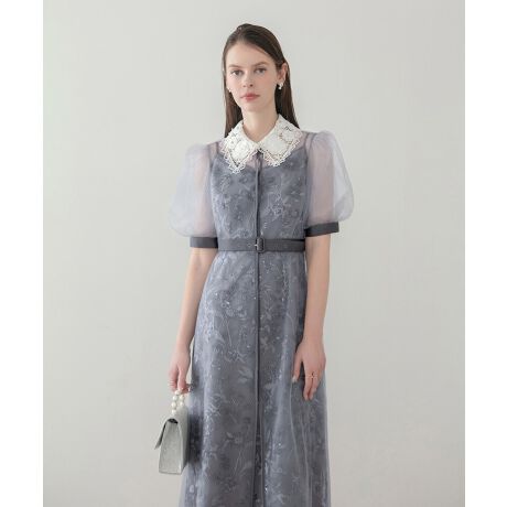 繊細なレースカラーとボディ全体に施されたスパンコール刺繍が目を引く、華やかなドレス