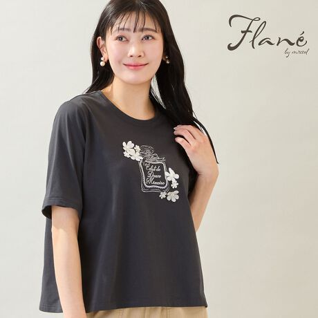 胸元にFlaneのアイコンである香水瓶をプリントしました。周りには立体的なお花のモチーフを散りばめたおとなフェミニンなデザインです。