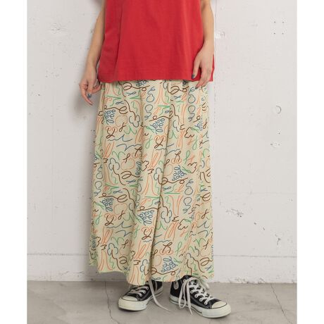 フルーツやロゴを踊るような線で表現したオリジナルテキスタイルのラップパンツ。さくらんぼやブドウのモチーフに、ブランド名の「p」と「d」の文字をミックスしています。微光沢があり、落ち感のある素材を使用した特別感のあるアイテムです。程よいボリューム感ですっきりとしたシルエット、スカートのように見えて動きやすいキュロット。キャッチーなプリント柄でシンプルなトップス合わせも着映えします。ウエストはゴム仕様、内紐でサイズ感の調節も可能です。両サイドポケット付き。