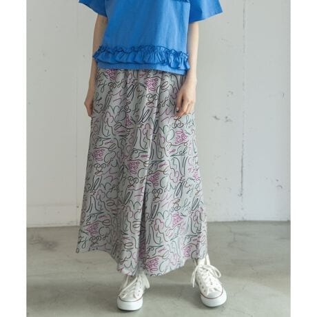 フルーツやロゴを踊るような線で表現したオリジナルテキスタイルのラップパンツ。さくらんぼやブドウのモチーフに、ブランド名の「p」と「d」の文字をミックスしています。微光沢があり、落ち感のある素材を使用した特別感のあるアイテムです。程よいボリューム感ですっきりとしたシルエット、スカートのように見えて動きやすいキュロット。キャッチーなプリント柄でシンプルなトップス合わせも着映えします。ウエストはゴム仕様、内紐でサイズ感の調節も可能です。両サイドポケット付き。