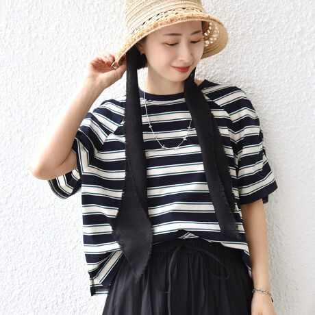 《予約》〈手洗い可能〉ボーダー / ソリッド 袖ギャザー ショートスリーブ プルオーバー