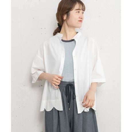 人気のブラウスが今年も登場。裾の大胆なスカラップがPOU DOU DOUらしいデザインです。肩が落ちたゆとりのある袖と、ひじにかかる袖丈が腕まわりをカバーし、リラックスした雰囲気で着られます。前後どちらを前にしても着用できる2way仕様。フルオープンにして羽織りとしてもお使いいただけます。着回しやすく、柄ボトムスとも相性の良いオフホワイトとブラックの無地に加え、ギンガムやストライプの定番柄もおすすめです。
