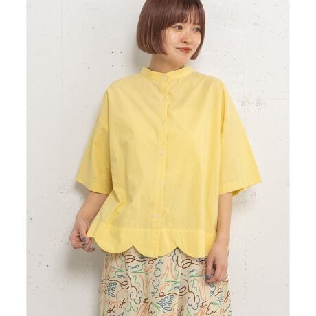 人気のブラウスが今年も登場。裾の大胆なスカラップがPOU DOU DOUらしいデザインです。肩が落ちたゆとりのある袖と、ひじにかかる袖丈が腕まわりをカバーし、リラックスした雰囲気で着られます。前後どちらを前にしても着用できる2way仕様。フルオープンにして羽織りとしてもお使いいただけます。着回しやすく、柄ボトムスとも相性の良いオフホワイトとブラックの無地に加え、ギンガムやストライプの定番柄もおすすめです。