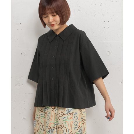 大きめのフラットカラーに太幅のタックを施したブラウス。タック止まりから広がる裾のシルエットもポイントです。表面感のあるドットドビー生地を使用し、特別感のある一枚に仕上げました。シンプルなシャツ袖ですっきりと、甘さを抑えたデザインです。