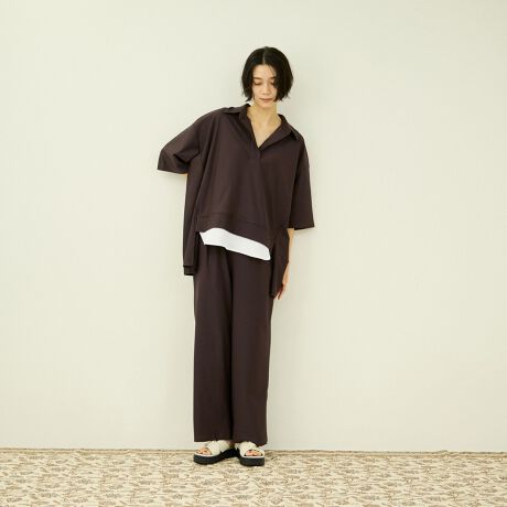 トップスは程よく抜け感のあるデザインで、パンツはストレートシルエットが美しく、全体にモードな印象を与えます。