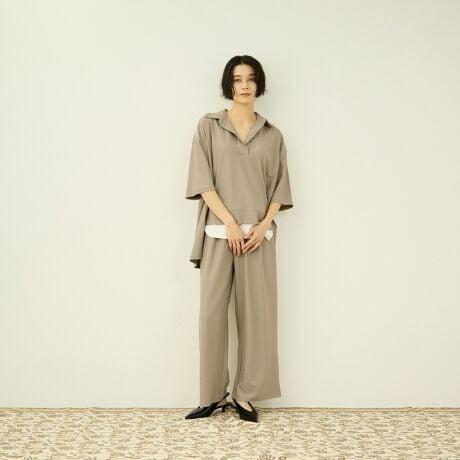 トップスは程よく抜け感のあるデザインで、パンツはストレートシルエットが美しく、全体にモードな印象を与えます。