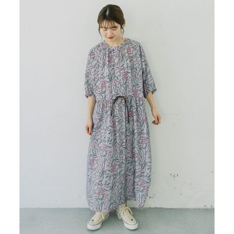 フルーツやロゴを踊るような線で表現したオリジナルテキスタイルのワンピース。さくらんぼやブドウのモチーフに、ブランド名の「p」と「d」の文字をミックスしています。微光沢があり、落ち感のある素材を使用した特別感のあるアイテムです。身頃続きのドルマンスリーブで、ウエストの紐でシルエットの調節が可能。前を開けて羽織としても着用できます。キャッチーなプリント柄で、1枚でもサマになるデザイン。両サイドポケット付き。