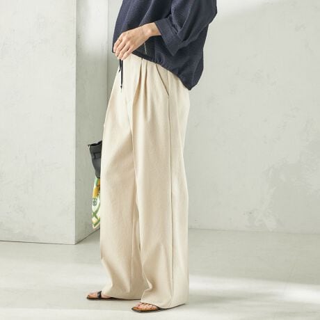 リネンライクシャンタンの2タックセミワイドパンツ。