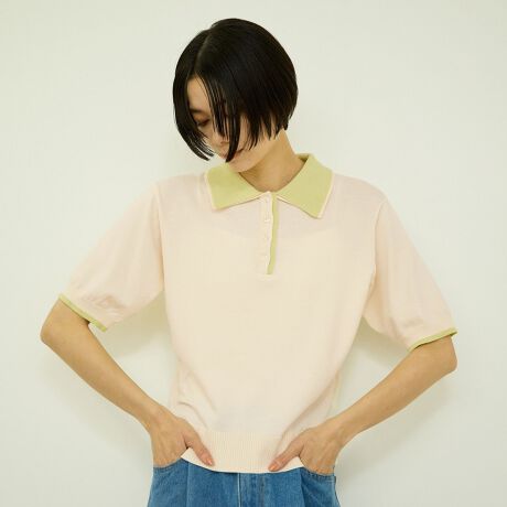 襟付きのポロデザインに、袖口や裾、襟に施された配色がアクセントとなり、シンプルながらも洗練された印象を演出します。