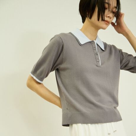 襟付きのポロデザインに、袖口や裾、襟に施された配色がアクセントとなり、シンプルながらも洗練された印象を演出します。