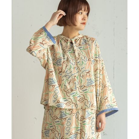 フルーツやロゴを踊るような線で表現したオリジナルテキスタイルのブラウス。さくらんぼやブドウのモチーフに、ブランド名の「p」と「d」の文字をミックスしています。微光沢があり、落ち感のある素材を使用した特別感のあるアイテムです。スタンドカラーから続くリボンディテールがポイントのブラウスは、羽織としても着られます。キャッチーなプリント柄で、1枚でもサマになるデザイン。袖口の配色使いもポイントです。