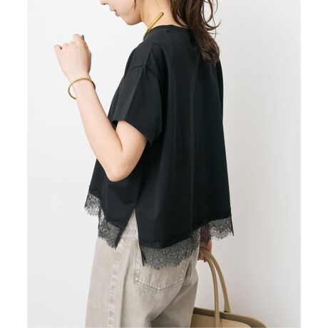 裾のランジェリーレースがシンプルなTシャツに上品なアクセントを添え、着るだけで華やぎがプラスされる大人のデイリートップスです。