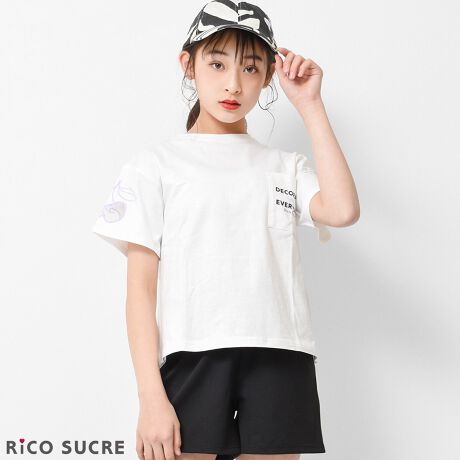 【item info】チュールチェリーTシャツ。両袖のチェリー柄チュールデザインがcuteな半袖Tシャツ。フロントはロゴ入りポケット仕様でバックにはプリントデザインを施しています。シンプルながらもデザインに凝った1枚です。