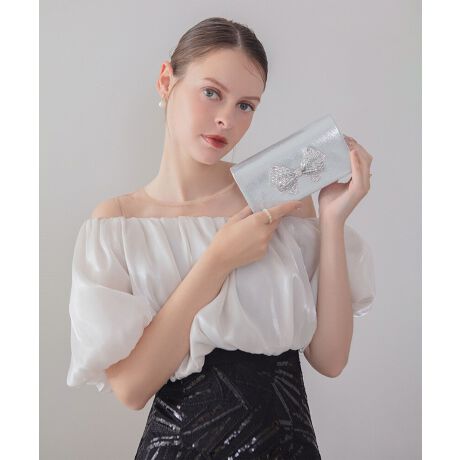 フロントに配された存在感溢れるリボンが、オケージョンシーンをドラマティックに彩る華やかなクラッチバッグ
