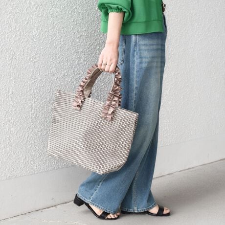 フリルデザインの持ち手が目を惹くトートバッグ。