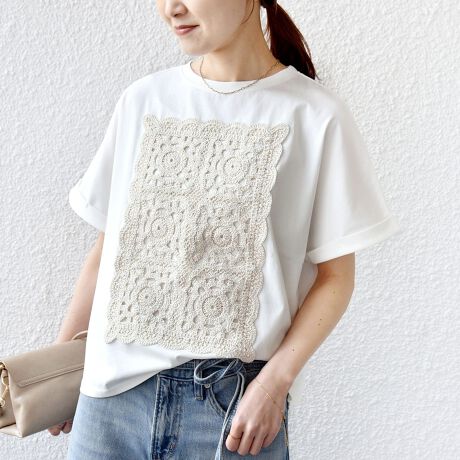 クロシェをドッキングした1枚着として存在感のあるTシャツです。