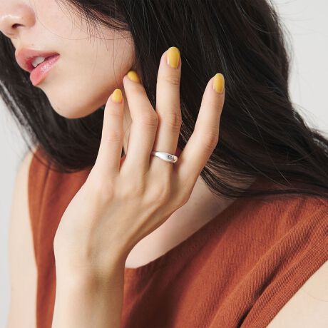 太めのシルバーリングがカジュアルなムードを纏いつつ、さりげなく女性らしさを演出する一品。