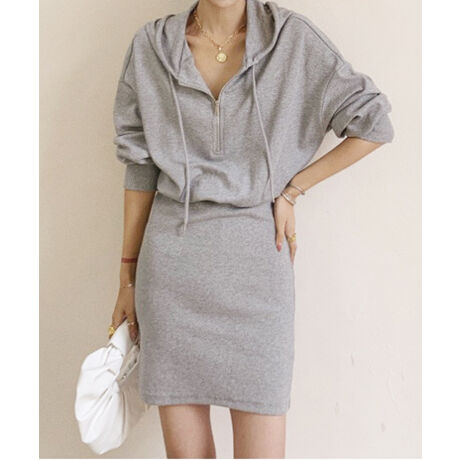 フード付きハーフジップ長袖タイトミニワンピース