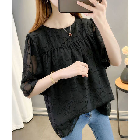 立体感のある花柄ジャガード素材を使用した、春夏にぴったり七分袖シフォンブラウス。