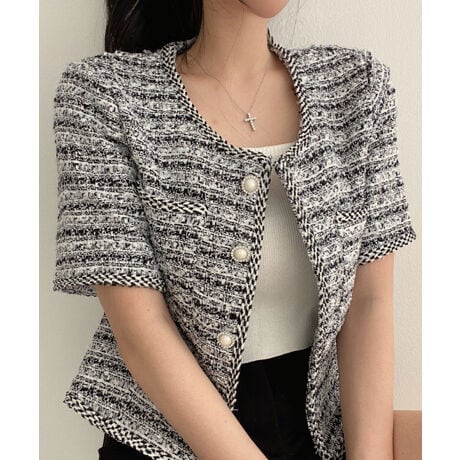 パールボタンツイード半袖ノーカラージャケット