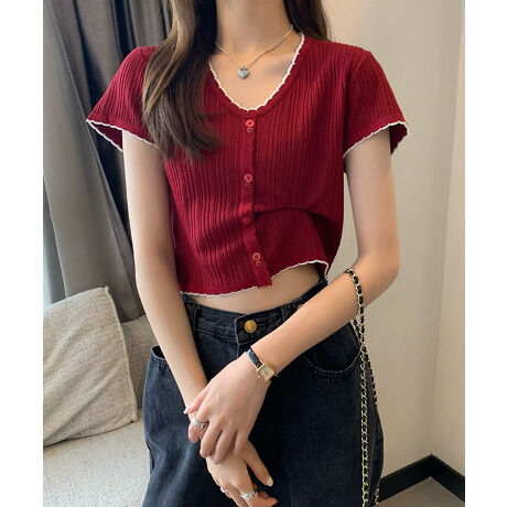 配色メロウとリブ素材が大人可愛い、コンパクトシルエットの半袖ニットカーディガン。