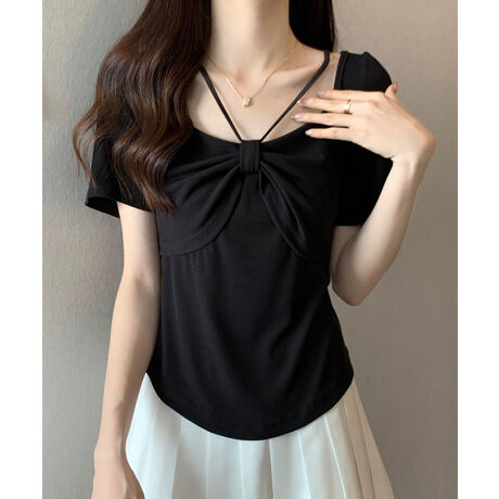リボンデザインと華奢ストラップで女性らしさを引き立てる、トレンド感たっぷりのコンパクトトップス。