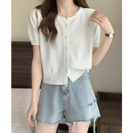 シンプル無地で着回し自在。1枚で大人の抜け感をつくる半袖ニットカーデ。