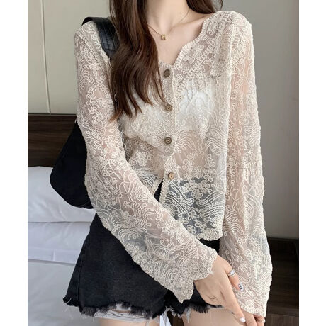 繊細な総レースで女性らしさを引き立てる、軽やかなシアーカーディガン。