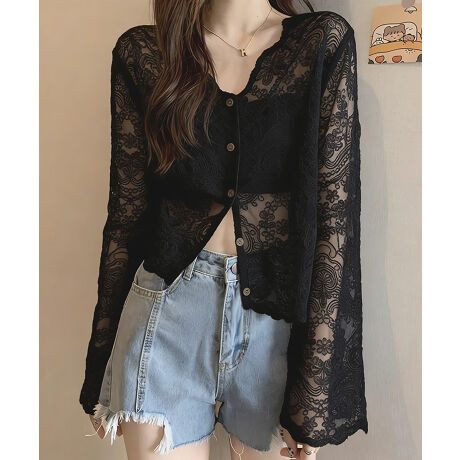 繊細な総レースで女性らしさを引き立てる、軽やかなシアーカーディガン。