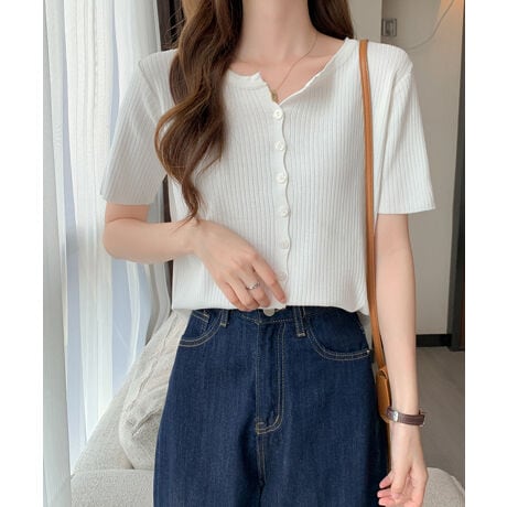 リブニット半袖カーディガントップス