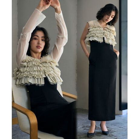 トップスはハリのあるナイロンタフタと、柔らかいチュールの異素材を使用し、フリルの存在感が際立ちます。