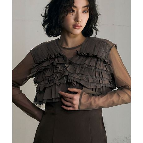 トップスはハリのあるナイロンタフタと、柔らかいチュールの異素材を使用し、フリルの存在感が際立ちます。